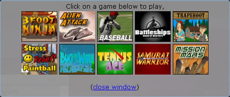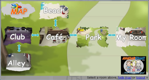 Alternatively, you can click the map icon to see a selection of rooms (shown below). Simply click on any room icon to enter that room. To exit the game, click the 'logout' link.