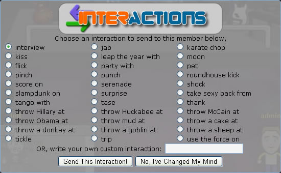 To access this feature, left click any avatar and select the option 'Send Interaction'. You will now be able to send an interaction as shown below.